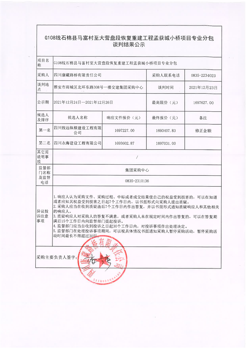 四川康藏路橋有限責(zé)任公司G108線石棉縣馬富村至大營盤段恢復(fù)重建工程孟獲城小橋項目專業(yè)分包談判結(jié)果公示