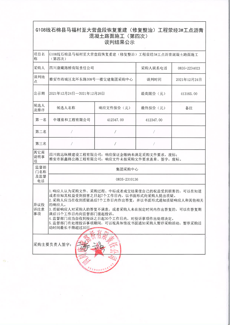 四川康藏路橋有限責(zé)任公司G108線石棉縣馬福村至大營(yíng)盤段恢復(fù)重建(修復(fù)整治)工程滎經(jīng)3#工點(diǎn)瀝青混凝土路面施工(第四次)談判結(jié)果公示