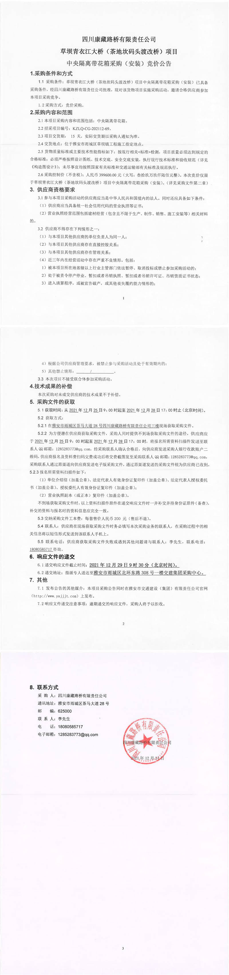 四川康藏路橋有限責(zé)任公司草壩青衣江大橋(茶地坎碼頭渡改橋)項(xiàng)目中央隔離帶花箱采購(gòu)(安裝)競(jìng)價(jià)公告