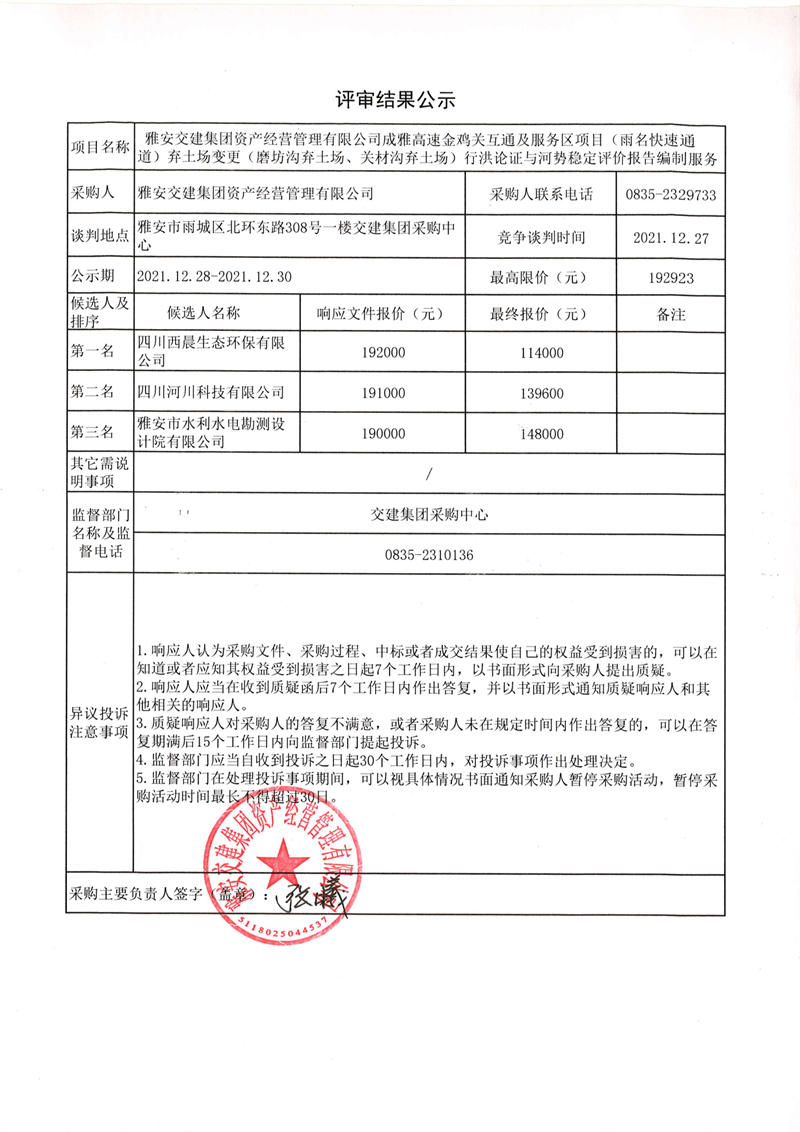 雅安交建集團資產(chǎn)經(jīng)營管理有限公司成雅高速金雞關互通及服務區(qū)項目(雨名快速通道)棄土場變更(磨坊溝棄土場、關材溝棄土場)行洪論證與河勢穩(wěn)定評價報告編制服務評審結果公示