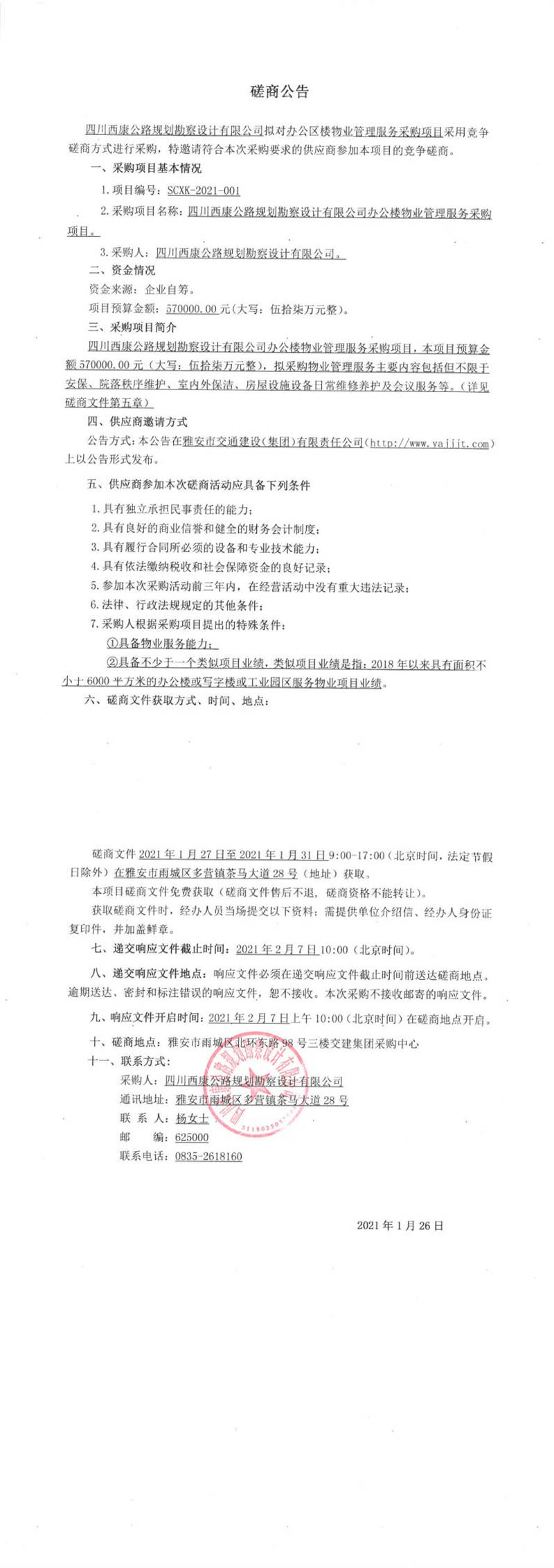 四川西康公路規(guī)劃勘察設(shè)計(jì)有限公司辦公樓物業(yè)管理服務(wù)采購項(xiàng)目競(jìng)爭磋商公告