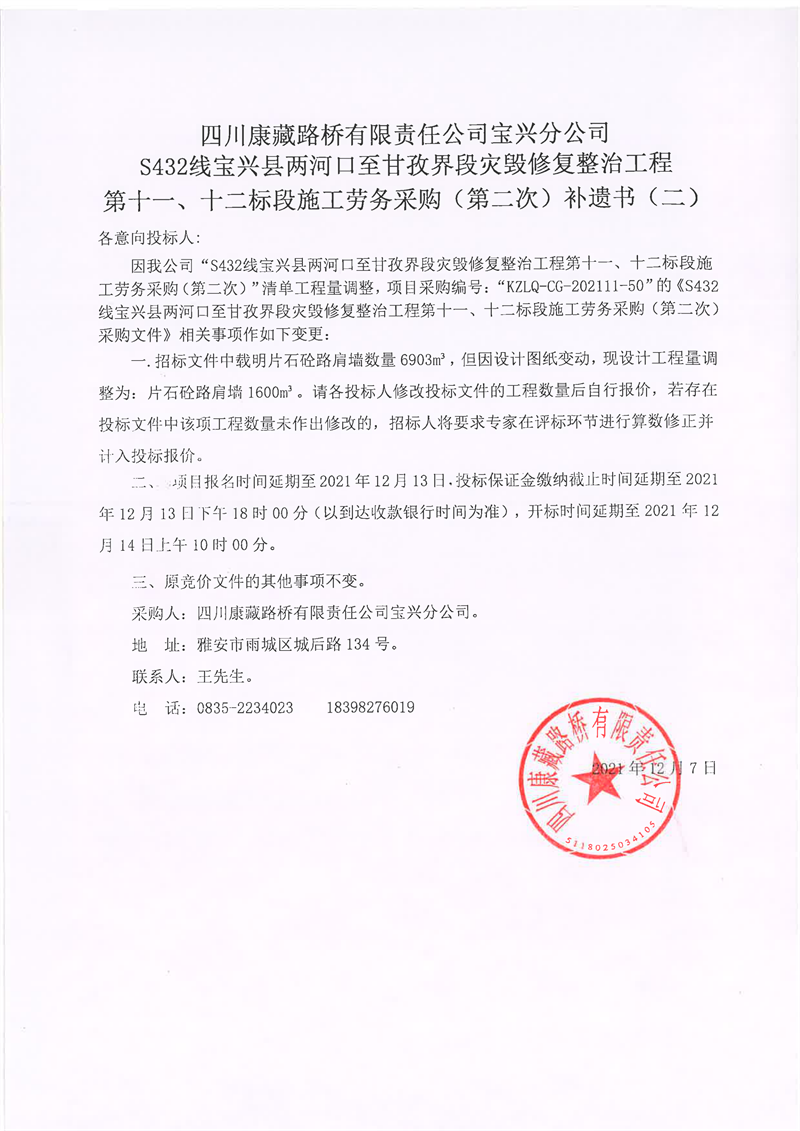 四川康藏路橋有限責任公司寶興分公司S432線寶興縣兩河口至甘孜界段災(zāi)毀修復整治工程第十一、十二標段施工勞務(wù)采購(第二次)補遺書(二)