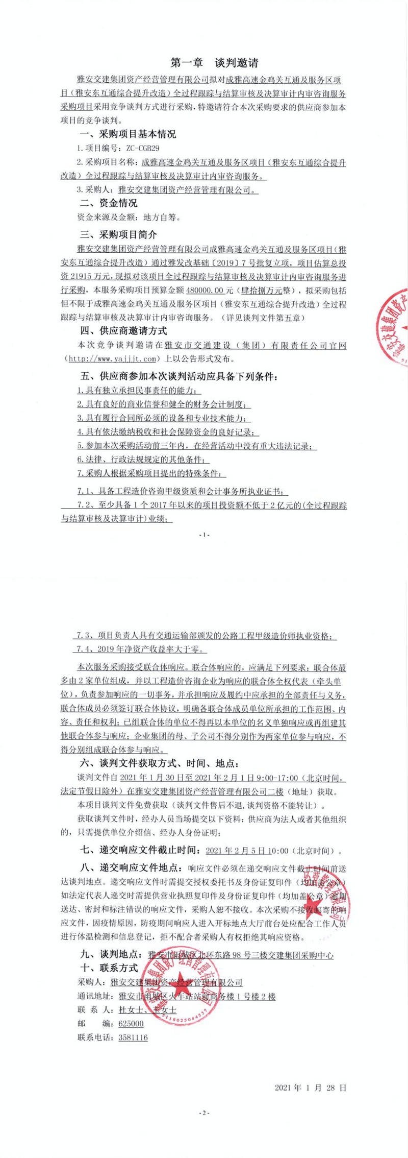 雅安交建集團資產(chǎn)經(jīng)營管理有限公司成雅高速金雞關互通及服務區(qū)項目(雅安東互通綜合提升改造)全過程跟蹤與結算審核及決算審計內(nèi)審咨詢服務談判公告