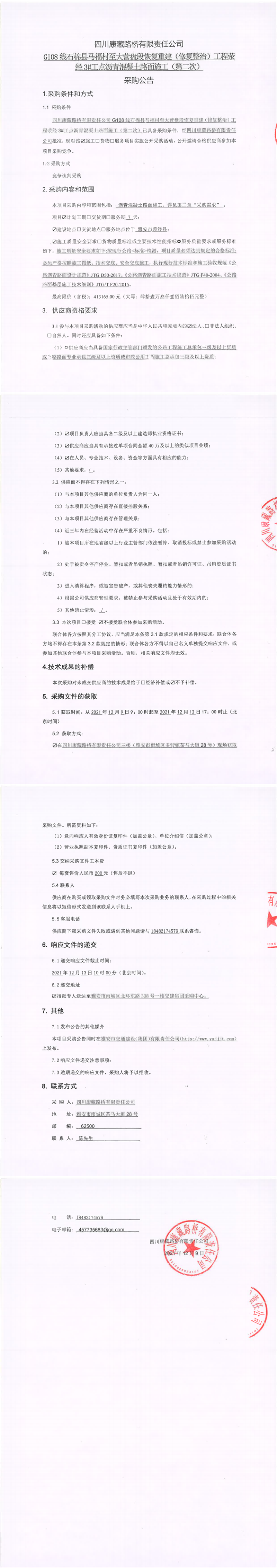 四川康藏路橋有限責(zé)任公司G108線石棉縣馬福村至大營(yíng)盤段恢復(fù)重建(修復(fù)整治)工程滎經(jīng)3#工點(diǎn)瀝青混凝土路面施工(第二次)采購(gòu)公告