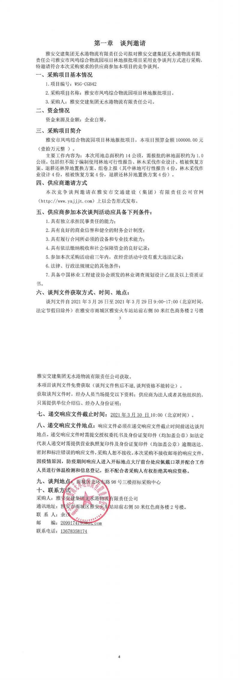 雅安交建集團無水港物流有限責任公司雅安市鳳鳴綜合物流園項目林地報批項目競爭談判公告