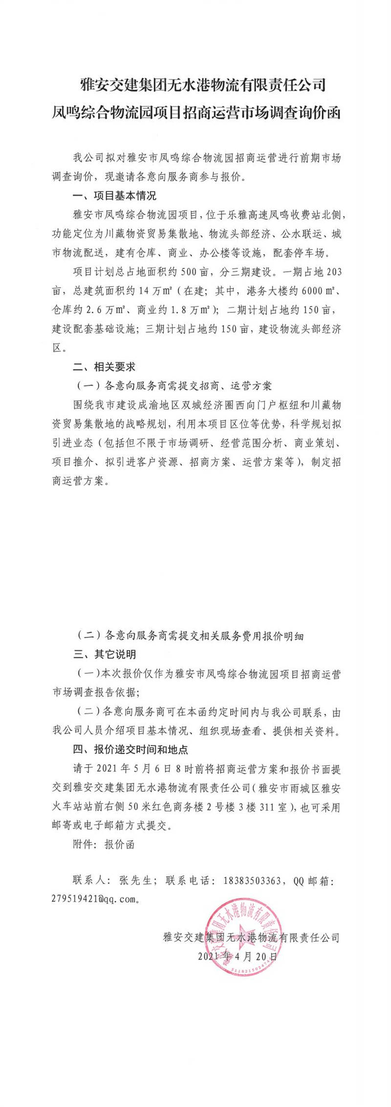 雅安交建集團(tuán)無水港物流有限責(zé)任公司鳳鳴綜合物流園項(xiàng)目招商運(yùn)營市場調(diào)查詢價(jià)函