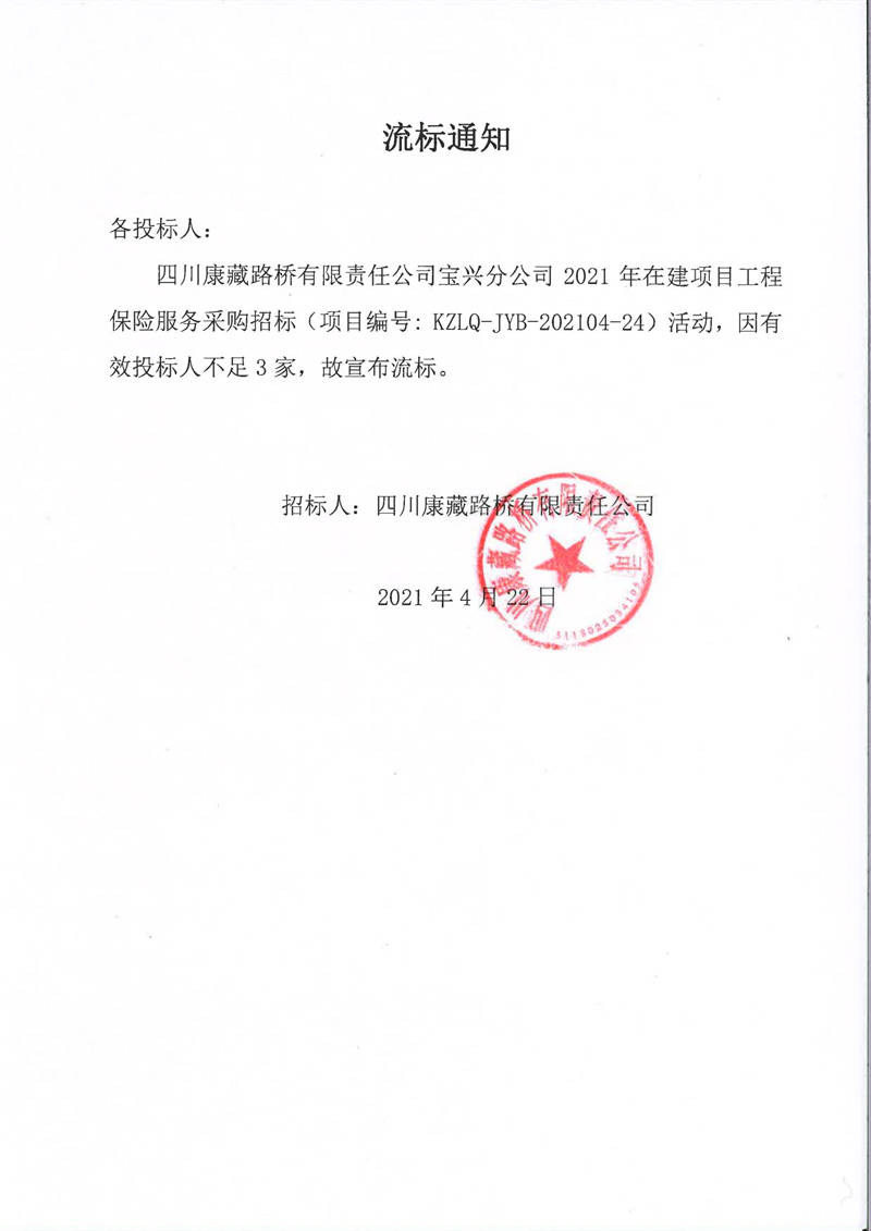 四川康藏路橋有限責任公司寶興分公司2021年在建項目工程保險服務采購流標通知