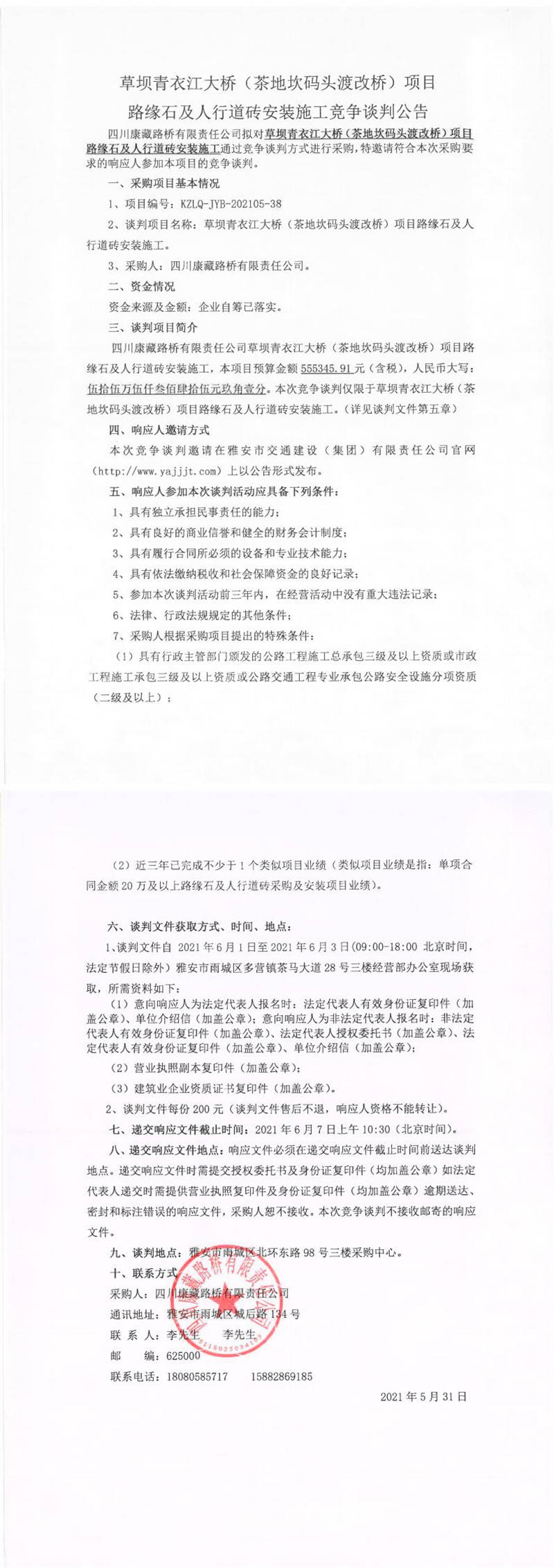 四川康藏路橋有限責任公司草壩青衣江大橋(茶地坎碼頭渡改橋)項目路緣石及人行道磚安裝施工競爭談判公告