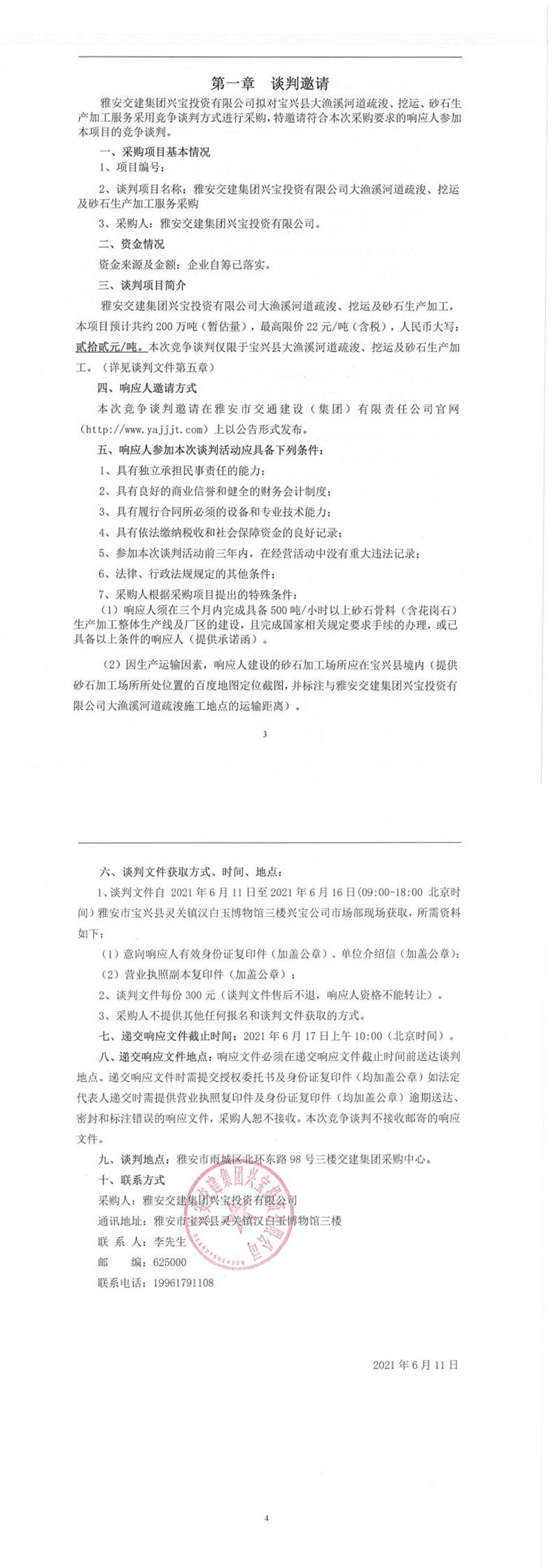 雅安交建集團(tuán)興寶投資有限公司大漁溪河道疏浚、挖運(yùn)及砂石生產(chǎn)加工服務(wù)采購競(jìng)爭(zhēng)談判公告