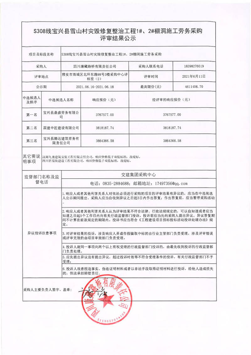 四川康藏路橋有限責任公司S308線寶興縣雪山村災毀修復整治工程1#、2#棚洞施工勞務采購評審結果公示