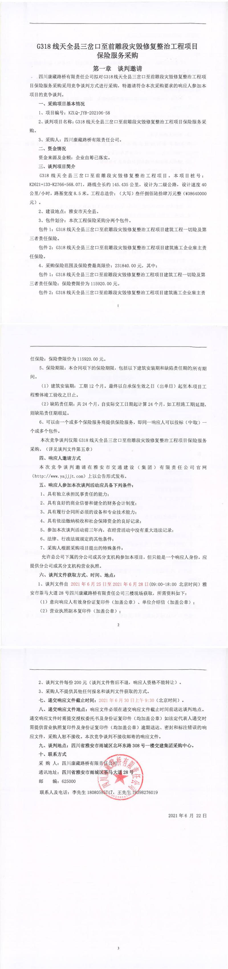 四川康藏路橋有限責(zé)任公司G318線天全縣三岔口至前雕段災(zāi)毀修復(fù)整治工程項(xiàng)目保險(xiǎn)服務(wù)采購(gòu)競(jìng)爭(zhēng)談判公告
