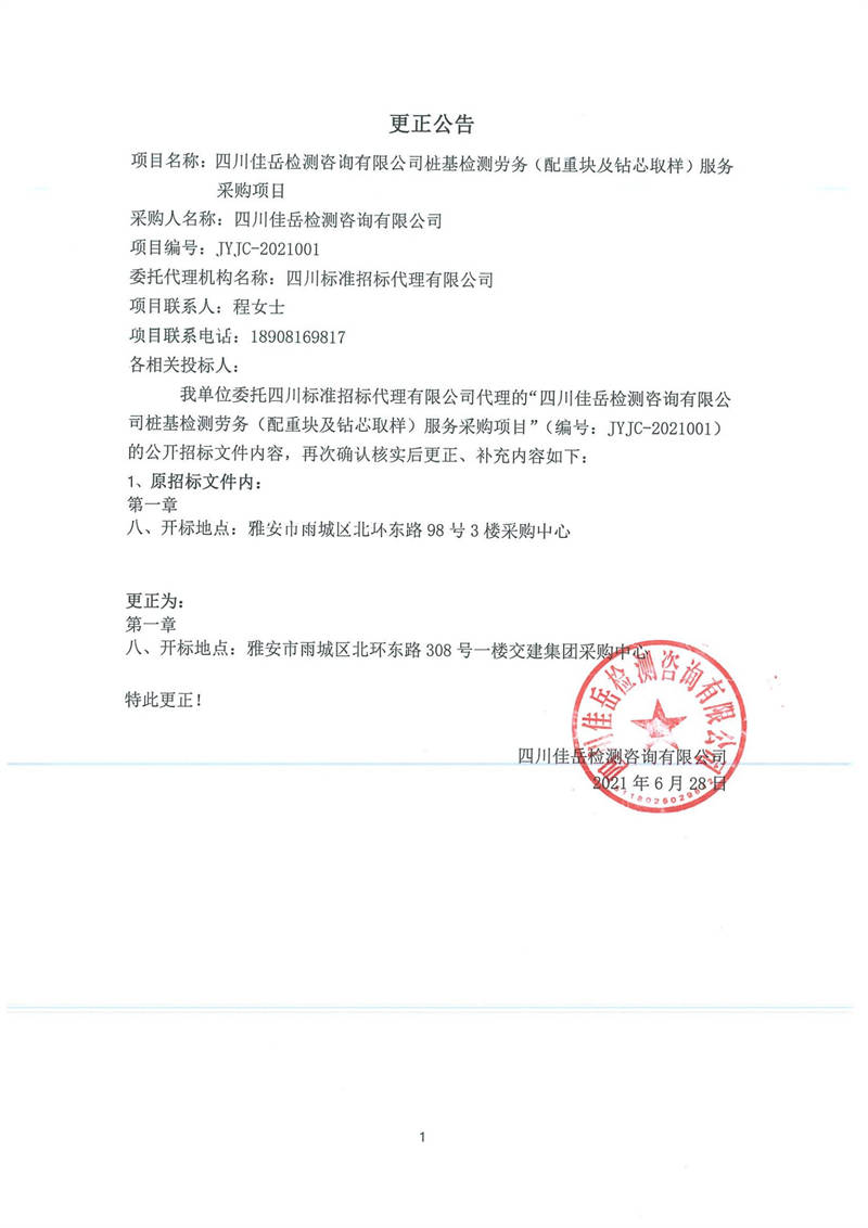 四川佳岳檢測(cè)咨詢有限公司樁基檢測(cè)勞務(wù)(配重塊及鉆芯取樣)服務(wù)采購項(xiàng)目更正公告