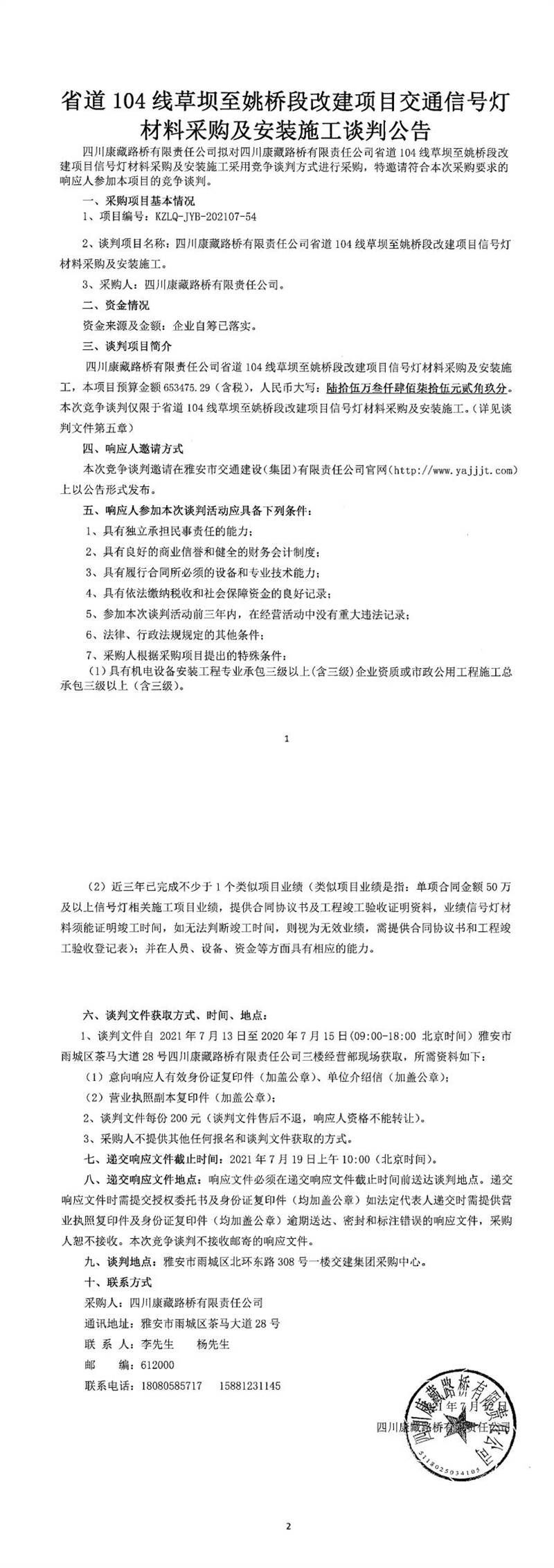 四川康藏路橋有限責(zé)任公司省道104線草壩至姚橋段改建項(xiàng)目交通信號(hào)燈材料采購及安裝施工競爭談判公告