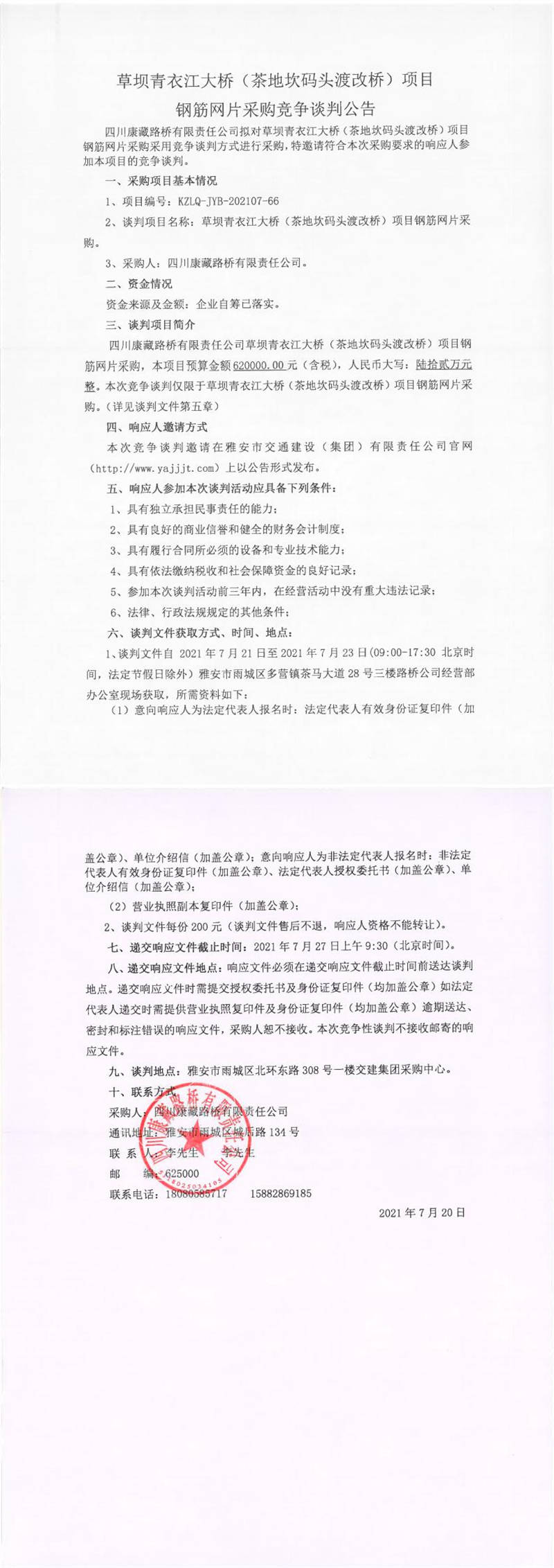 四川康藏路橋有限責(zé)任公司草壩青衣江大橋(茶地坎碼頭渡改橋)項(xiàng)目鋼筋網(wǎng)片采購競(jìng)爭談判公告