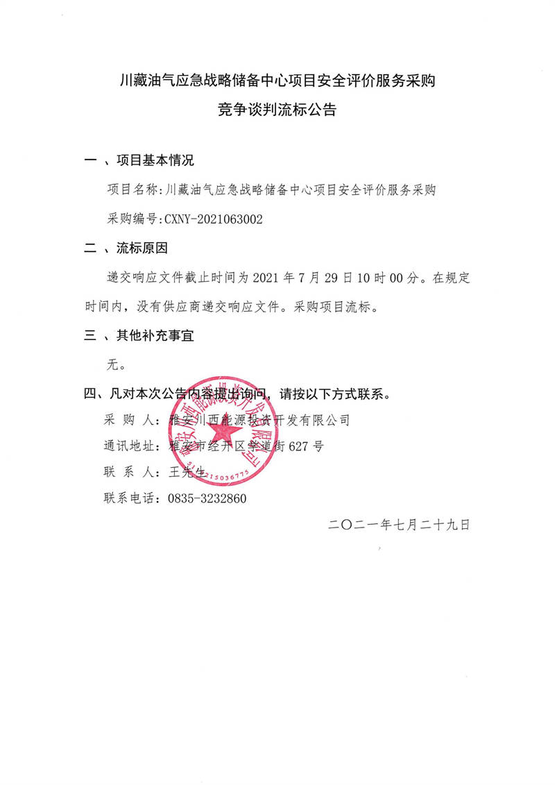 雅安川西能源投資開發(fā)有限公司川藏油氣應(yīng)急戰(zhàn)略儲備中心項目安全評價服務(wù)采購競爭談判流標(biāo)公告