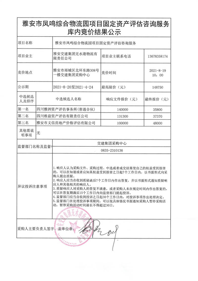 雅安交建集團無水港物流有限責任公司雅安市鳳鳴綜合物流園項目固定資產(chǎn)評估咨詢服務庫內(nèi)競價結果公示