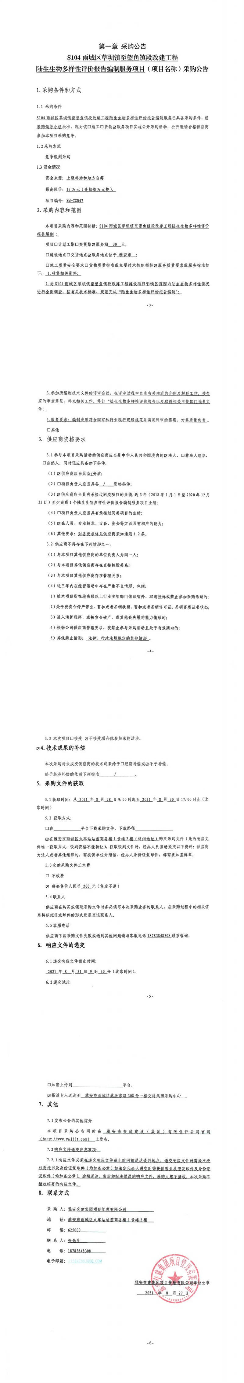 雅安交建集團(tuán)項目管理有限公司S104雨城區(qū)草壩鎮(zhèn)至望魚鎮(zhèn)段改建工程陸生生物多樣性評價報告編制服務(wù)項目采購公告