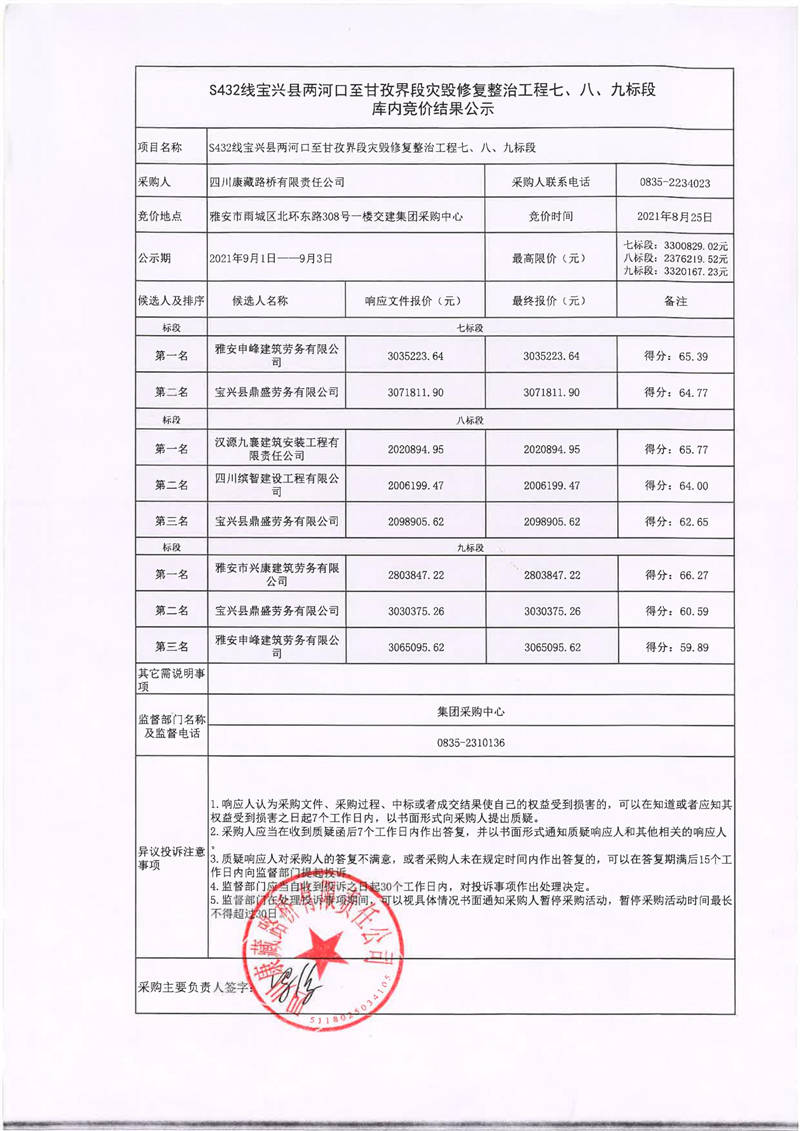四川康藏路橋有限責(zé)任公司S432線寶興縣兩河口至甘孜界段災(zāi)毀修復(fù)整治工程七、八、九標(biāo)段庫內(nèi)競(jìng)價(jià)結(jié)果公示