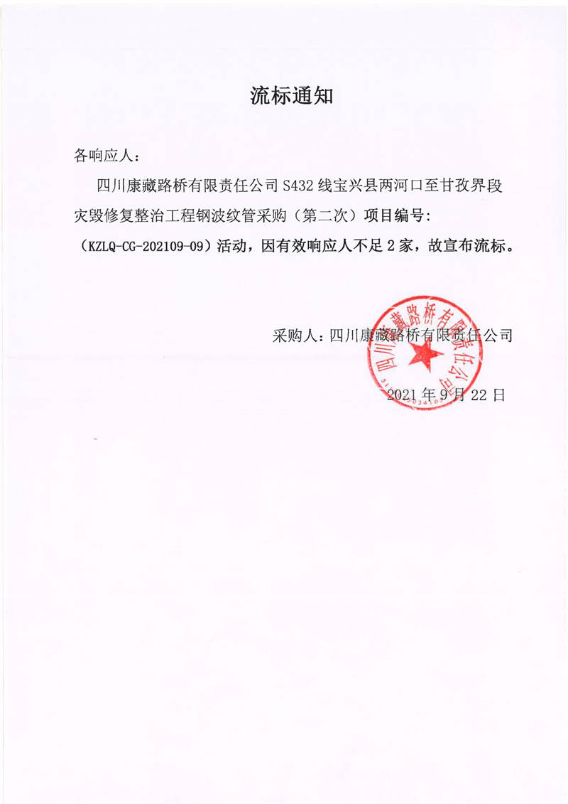 四川康藏路橋有限責(zé)任公司S432線寶興縣兩河口至甘孜界段災(zāi)毀修復(fù)整治工程鋼波紋管采購(gòu)(第二次)流標(biāo)通知