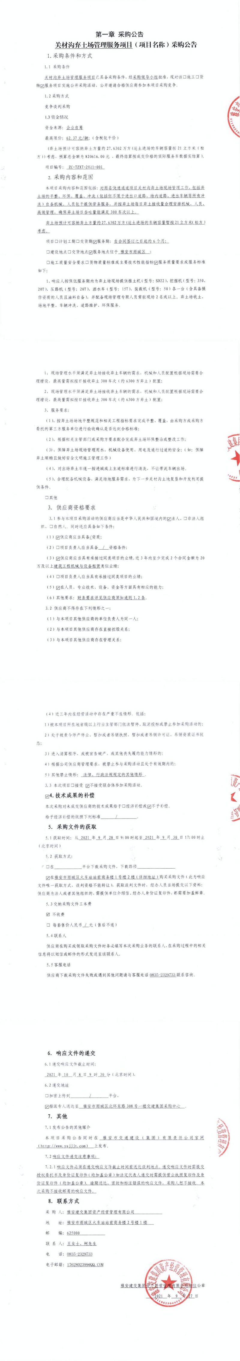 雅安交建集團資產(chǎn)經(jīng)營管理有限公司關(guān)材溝棄土場管理服務(wù)項目采購公告