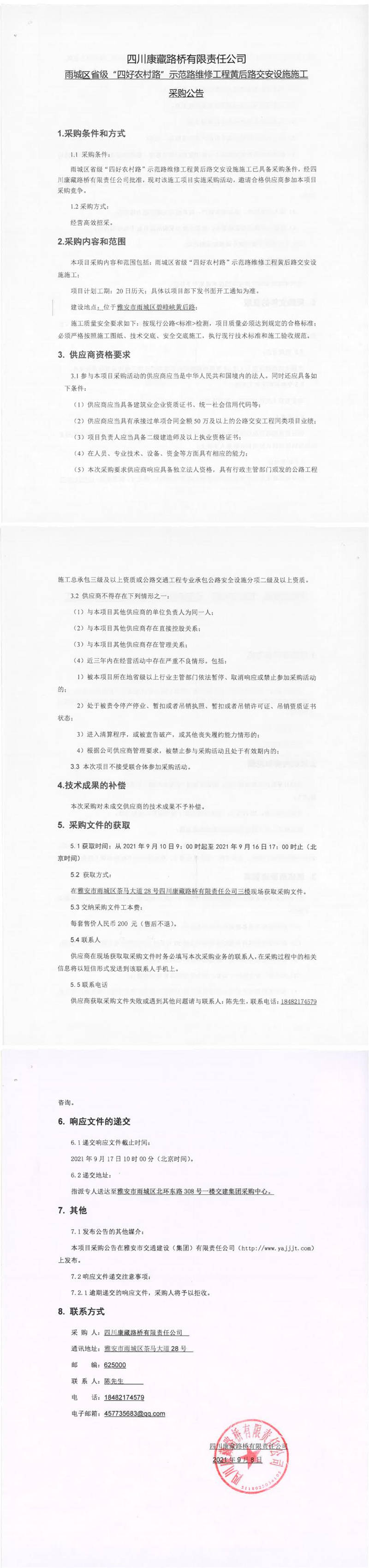 四川康藏路橋有限責任公司雨城區(qū)省級“四好農(nóng)村路”示范路維修工程黃后路交安設(shè)施施工采購公告
