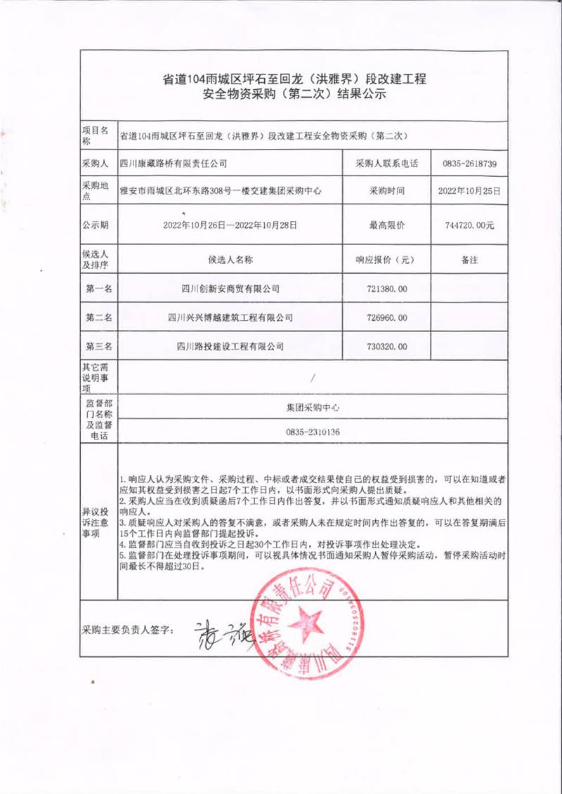 四川康藏路橋有限責(zé)任公司省道104雨城區(qū)坪石至回龍(洪雅界)段改建工程安全物資采購(第二次)結(jié)果公示