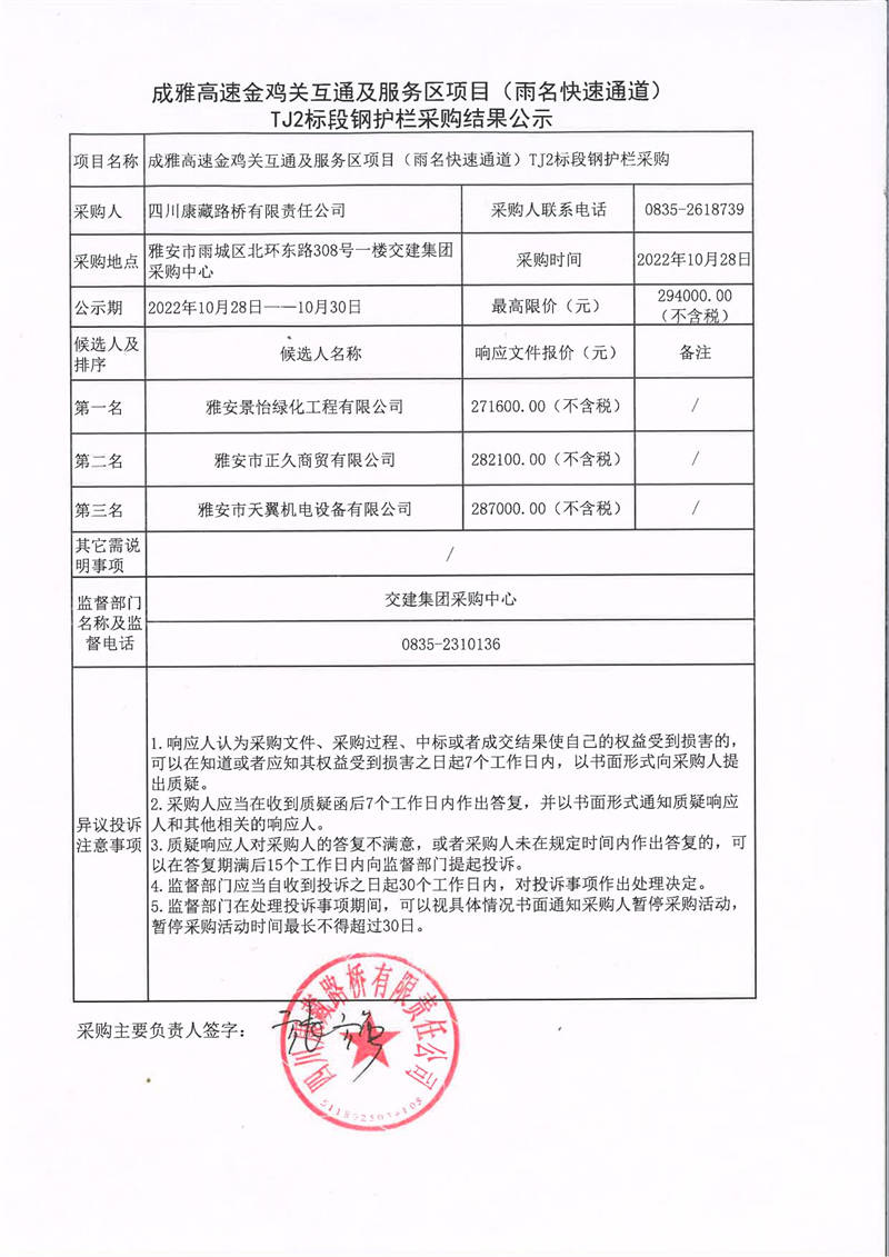 四川康藏路橋有限責(zé)任公司成都高速金雞關(guān)互通及服務(wù)區(qū)項目(雨名快速通道)TJ2標(biāo)段鋼護(hù)欄采購結(jié)果公示