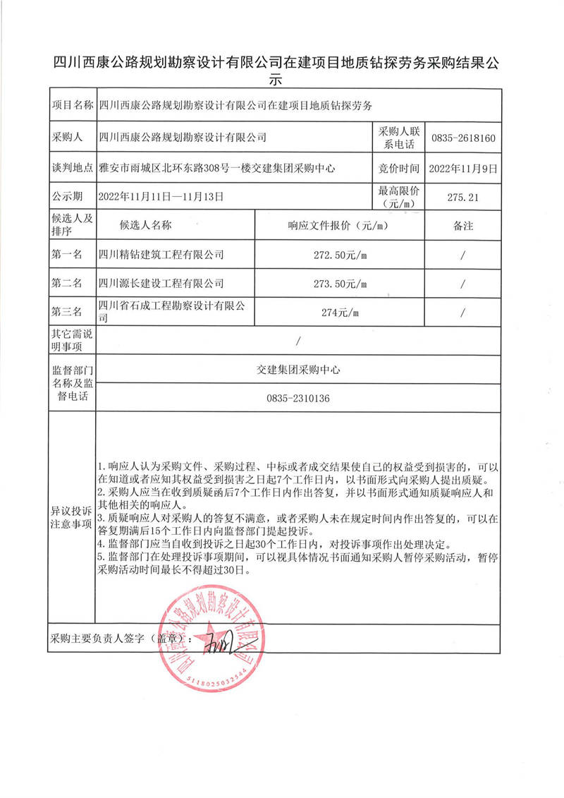 四川西康公路規(guī)劃勘察設計有限公司在建項目地質鉆探勞務采購結果公示