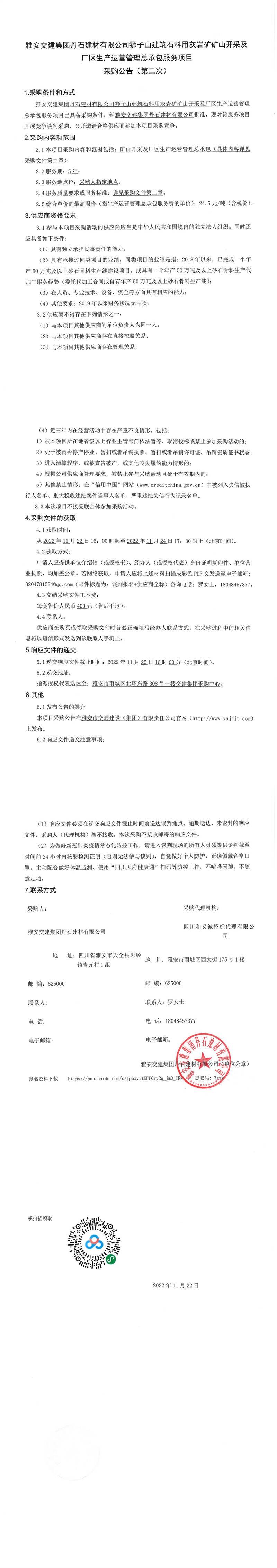 雅安交建集團丹石建材有限公司獅子山建筑石料用灰?guī)r礦礦山開采及廠區(qū)生產(chǎn)運營管理總承包服務(wù)項目采購公告(第二次)