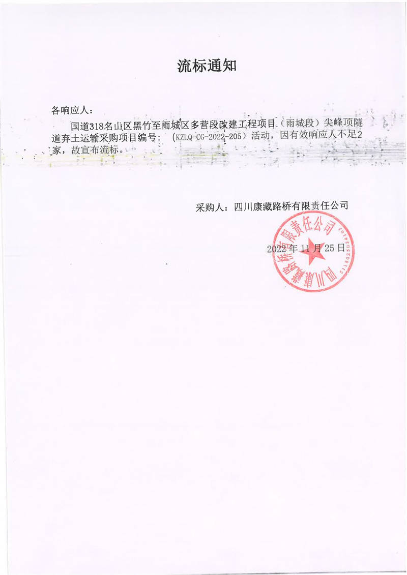 四川康藏路橋有限責(zé)任公司國道318名山區(qū)黑竹至雨城區(qū)多營段改建工程項(xiàng)目(雨城段)尖峰頂隧道棄土運(yùn)輸采購項(xiàng)目流標(biāo)通知
