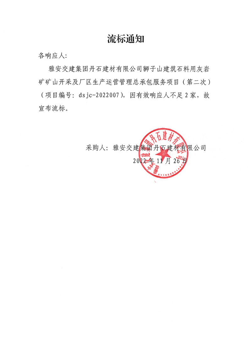 雅安交建集團(tuán)丹石建材有限公司獅子山建筑石料用灰?guī)r礦礦山開采及廠區(qū)生產(chǎn)運(yùn)營管理總承包服務(wù)項(xiàng)目(第二次)流標(biāo)通知