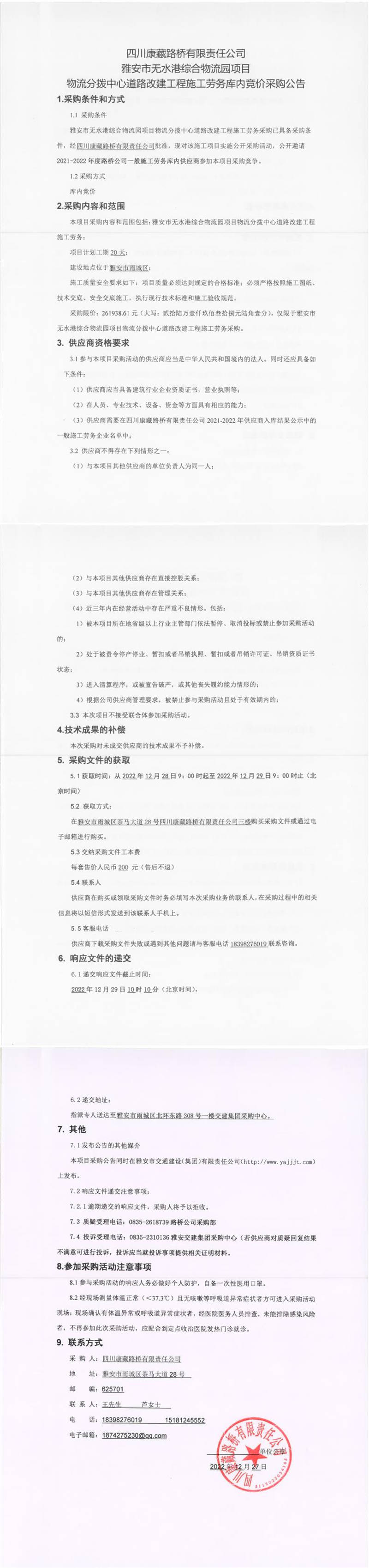 四川康藏路橋有限責(zé)任公司雅安市無水港綜合物流園項目物流分撥中心道路改建工程施工勞務(wù)庫內(nèi)競價采購公告