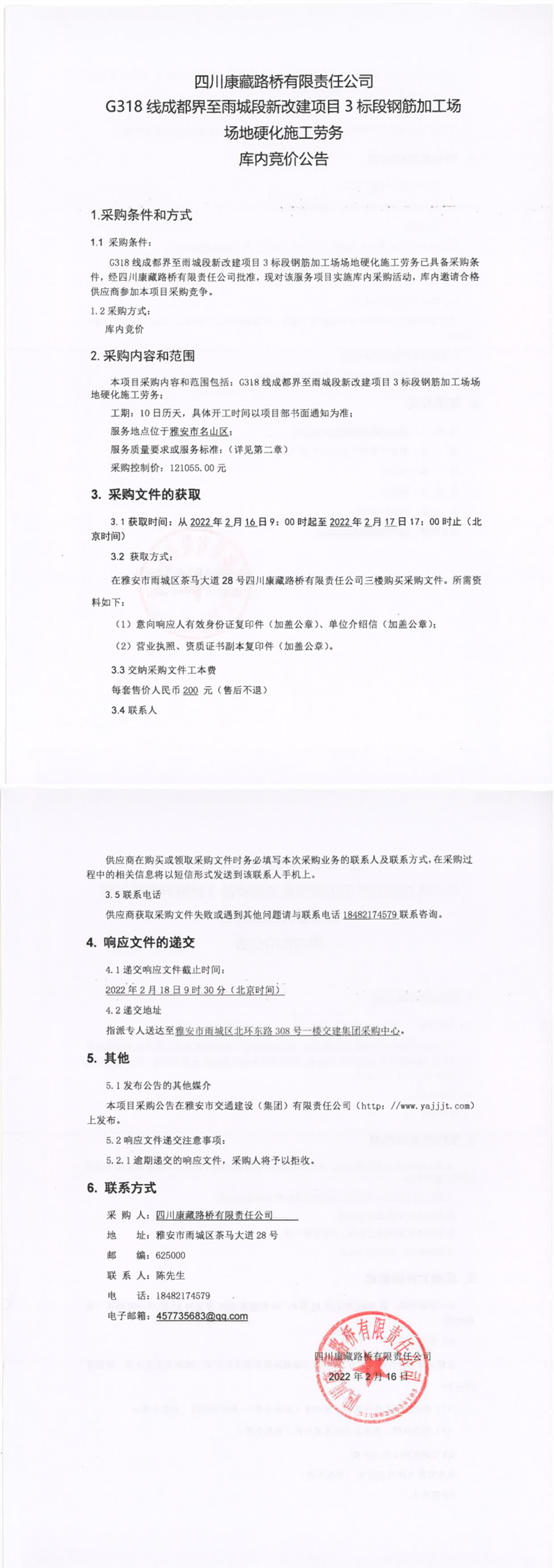四川康藏路橋有限責任公司G318線成都界至雨城段新改建項目3標段鋼筋加工場場地硬化施工勞務庫內(nèi)競價公告