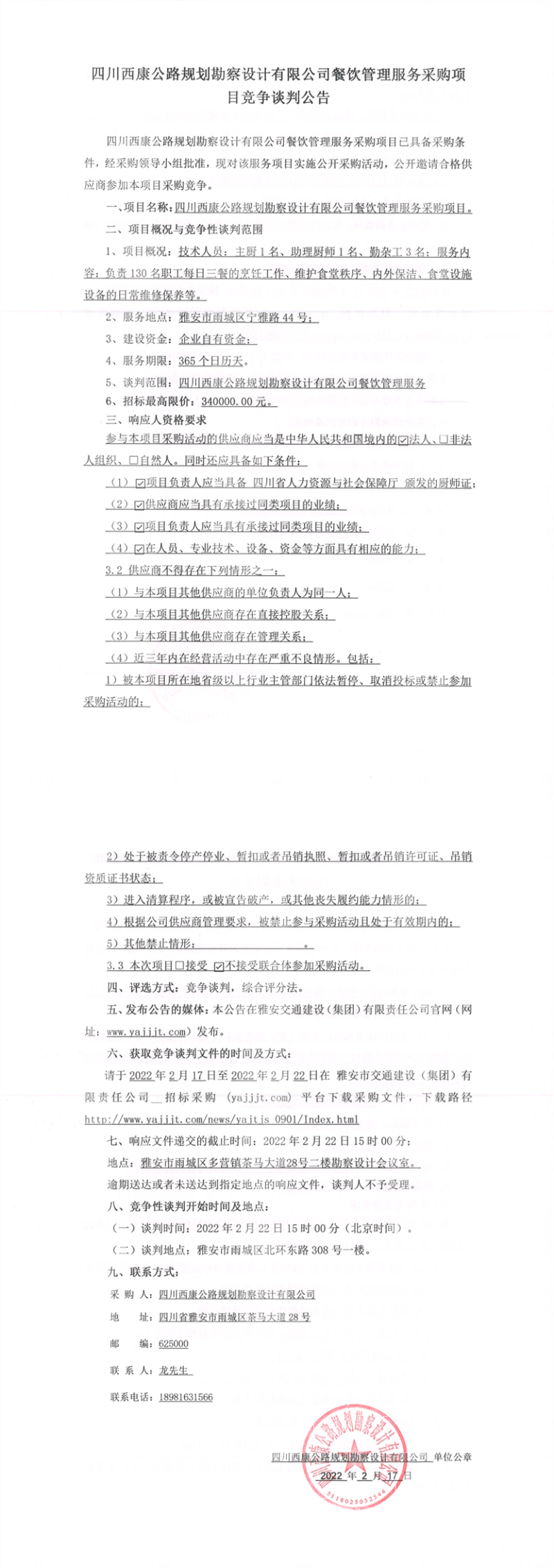 四川西康公路規(guī)劃勘察設(shè)計(jì)有限公司餐飲管理服務(wù)采購項(xiàng)目競爭談判公告