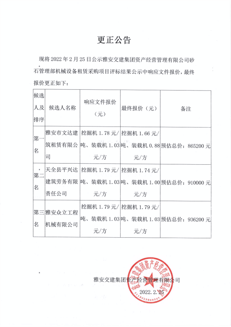 雅安交建集團(tuán)資產(chǎn)經(jīng)營管理有限公司砂石管理部機(jī)械設(shè)備租賃采購項(xiàng)目評(píng)標(biāo)結(jié)果公示更正公告