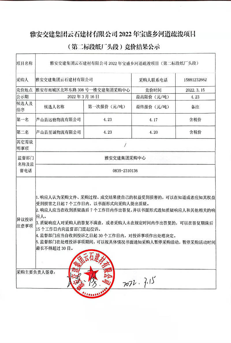 雅安交建集團(tuán)云石建材有限公司2022年寶盛鄉(xiāng)河道疏浚項目(第二標(biāo)段紙廠頭段)競價結(jié)果公示