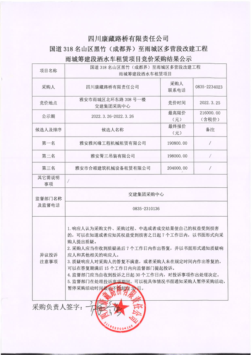 四川康藏路橋有限責(zé)任公司國道318名山區(qū)黑竹(成都界)至雨城區(qū)多營段改建工程雨城籌建段灑水車租賃項(xiàng)目競價采購結(jié)果公示