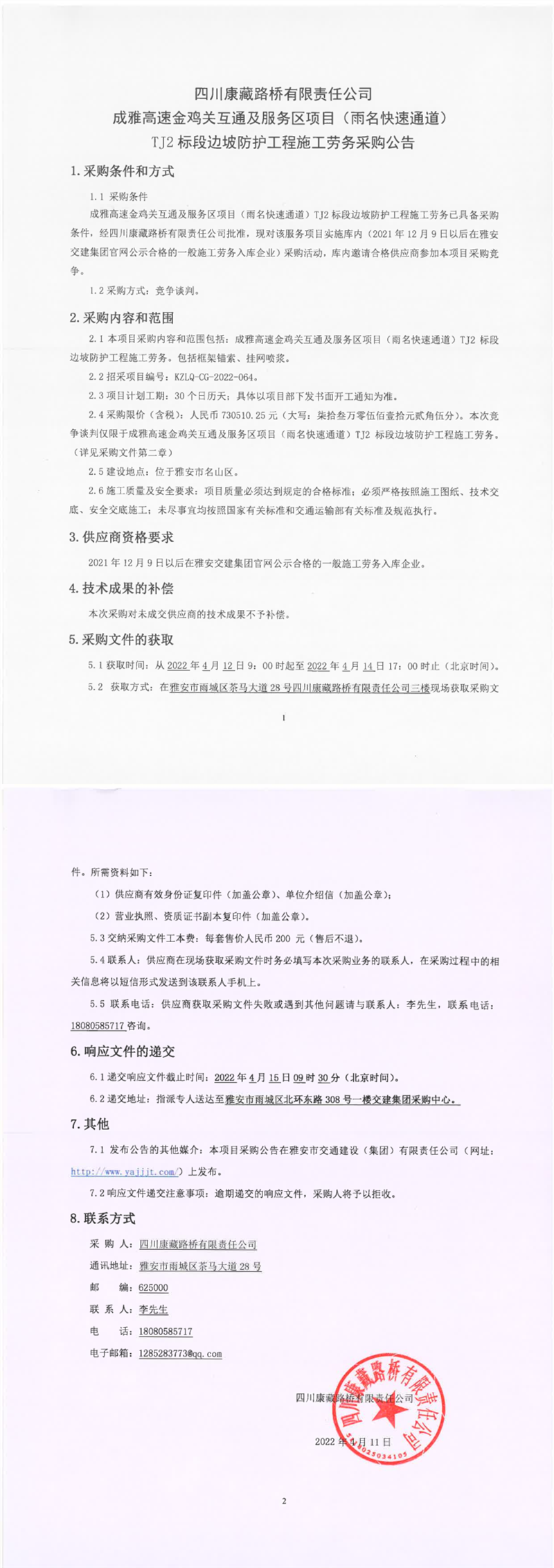 四川康藏路橋有限責任公司成雅高速金雞關(guān)互通及服務區(qū)項目(雨名快速通道)TJ2標段邊坡防護工程施工勞務采購公告