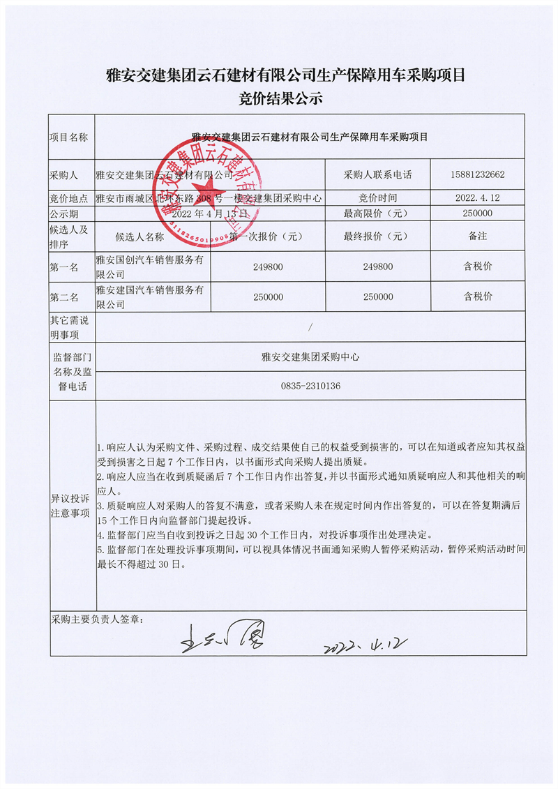 雅安交建集團(tuán)云石建材有限公司生產(chǎn)保障用車采購(gòu)項(xiàng)目競(jìng)價(jià)結(jié)果公示