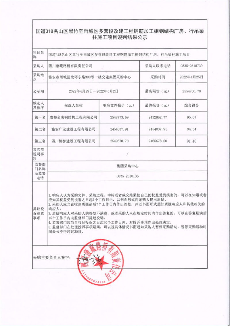 四川康藏路橋有限責(zé)任公司國道318名山區(qū)黑竹至雨城區(qū)多營段改建工程鋼筋加工棚鋼結(jié)構(gòu)廠房、行吊梁柱施工項目談判結(jié)果公示