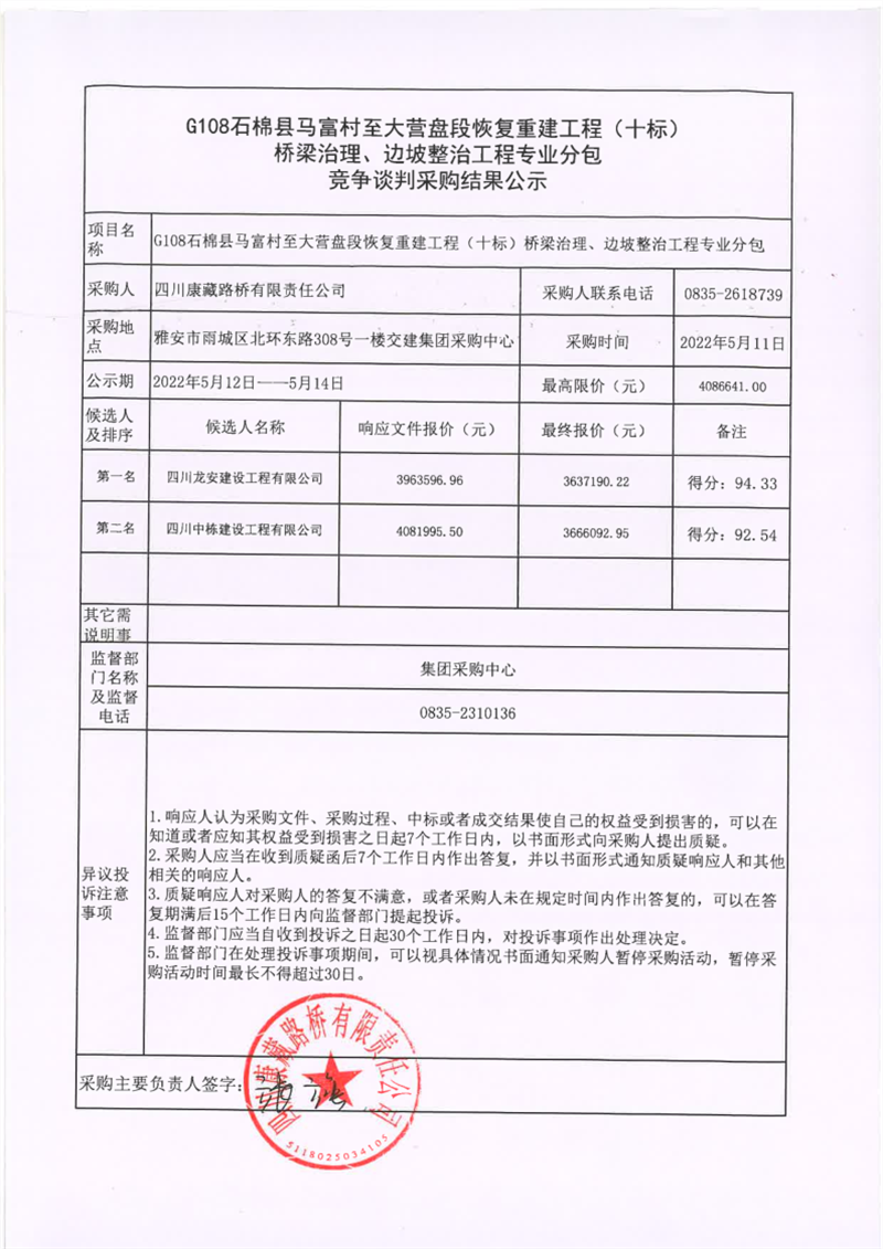 四川康藏路橋有限責(zé)任公司G108線石棉縣馬富村至大營盤段恢復(fù)重建工程(十標(biāo))橋梁治理、邊坡整治工程專業(yè)分包競爭談判采購結(jié)果公示