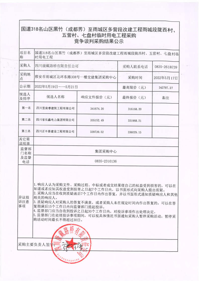 四川康藏路橋有限責(zé)任公司國(guó)道318名山區(qū)黑竹(成都界)至雨城區(qū)多營(yíng)段改建工程雨城段隴西村、五營(yíng)村、七盤村臨時(shí)用電工程采購(gòu)競(jìng)爭(zhēng)談判結(jié)果公示