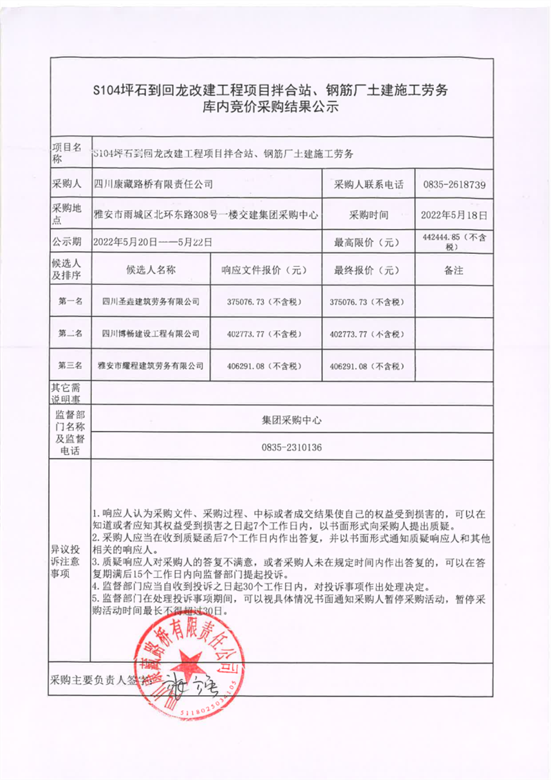 四川康藏路橋有限責(zé)任公司S104坪石到回龍改建工程項目拌合站、鋼筋廠土建施工勞務(wù)庫內(nèi)競價采購結(jié)果公示