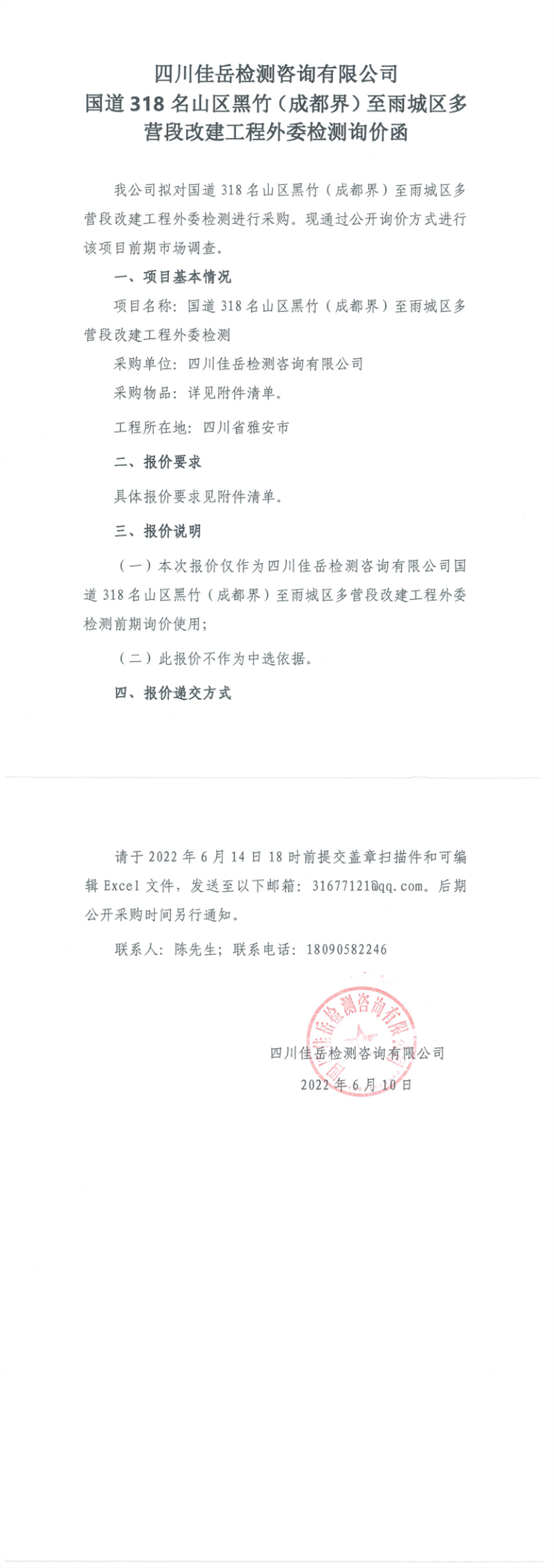 四川佳岳檢測咨詢有限公司國道318名山區(qū)黑竹(成都界)至雨城區(qū)多營段改建工程外委檢測詢價函