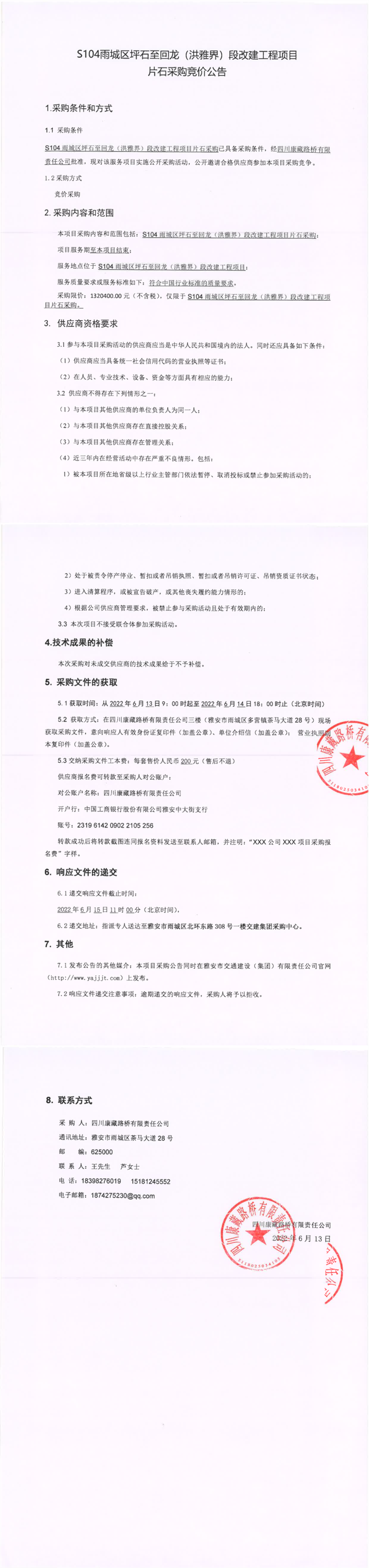 四川康藏路橋有限責(zé)任公司S104雨城區(qū)坪石至回龍(洪雅界)段改建工程項目片石采購競價公告