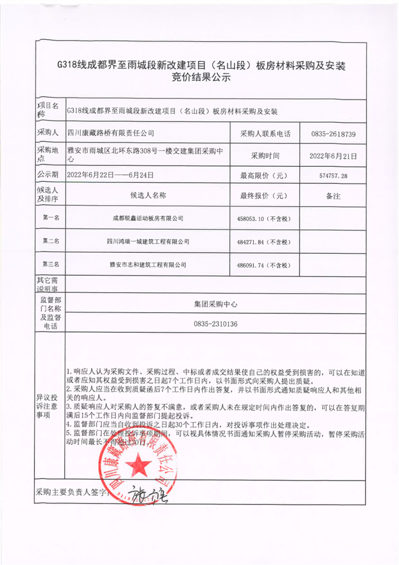 四川康藏路橋有限責任公司G318線成都界至雨城段新改建項目(名山段)板房材料采購及安裝競價結(jié)果公示