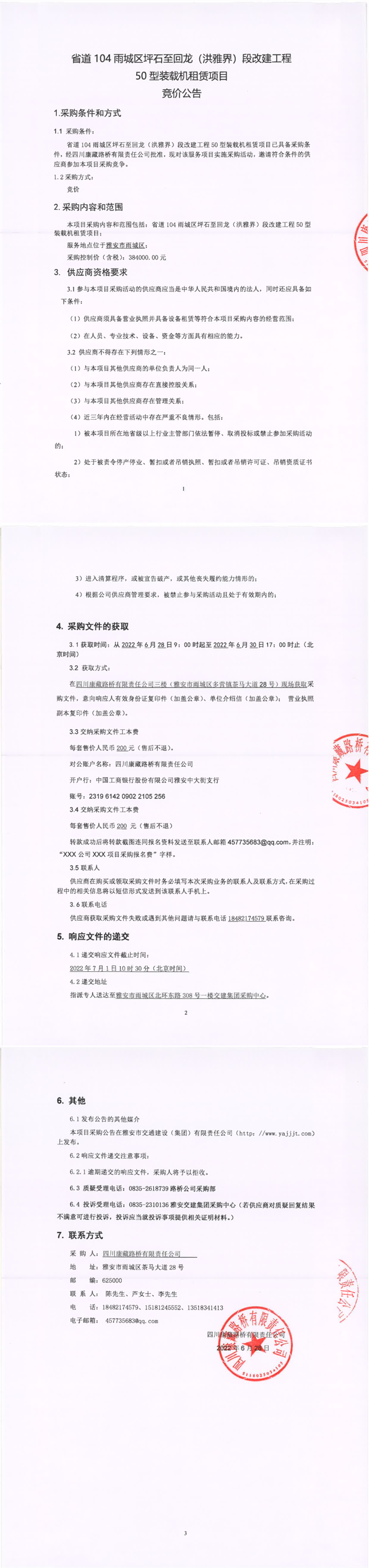 四川康藏路橋有限責(zé)任公司省道104雨城區(qū)坪石至回龍(洪雅界)段改建工程50型裝載機(jī)租賃項(xiàng)目競(jìng)價(jià)公告