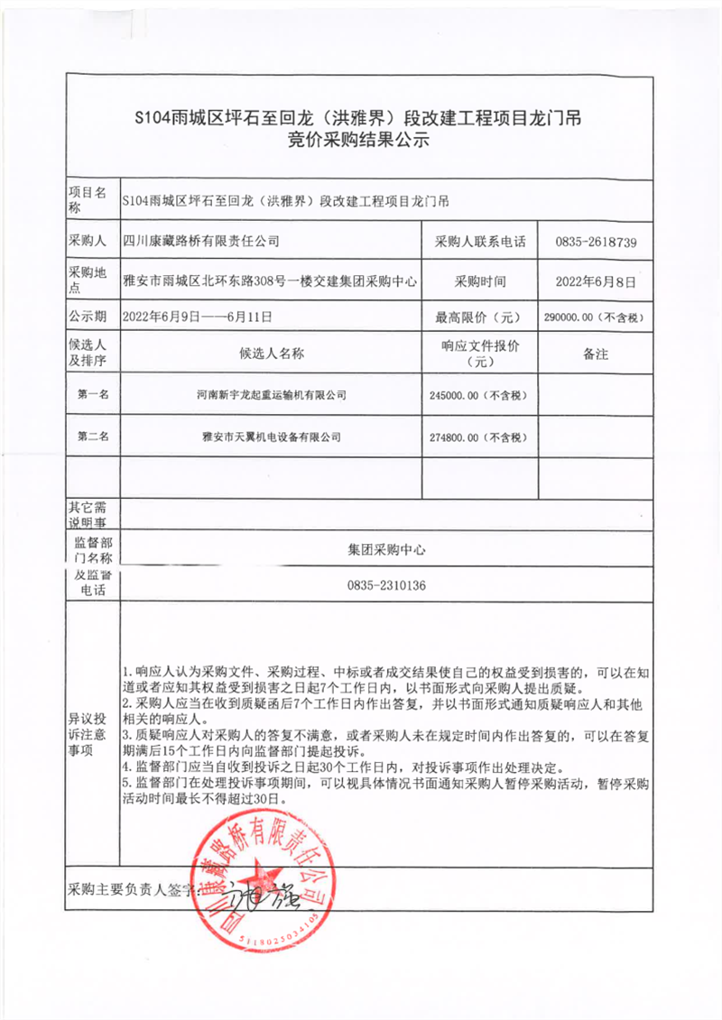 四川康藏路橋有限責(zé)任公司S104雨城區(qū)坪石至回龍(洪雅界)段改建工程項(xiàng)目龍門吊競(jìng)價(jià)采購結(jié)果公示