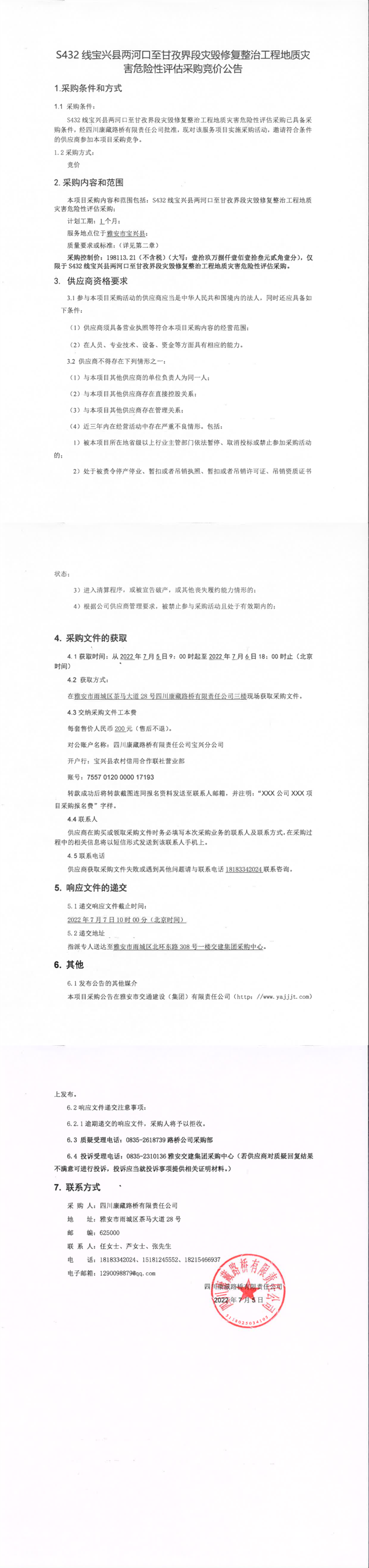 四川康藏路橋有限責(zé)任公司S432線寶興縣兩河口至甘孜界段災(zāi)毀修復(fù)整治工程地質(zhì)災(zāi)害危險(xiǎn)性評(píng)估采購競價(jià)公告