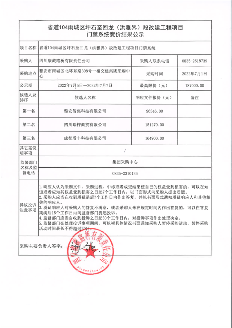 四川康藏路橋有限責(zé)任公司省道104雨城區(qū)坪石至回龍(洪雅界)段改建工程門禁系統(tǒng)競價(jià)結(jié)果公示